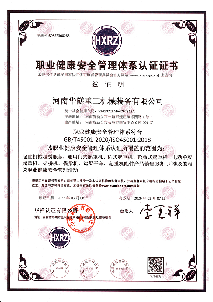職業健康安全管理體系認證證書